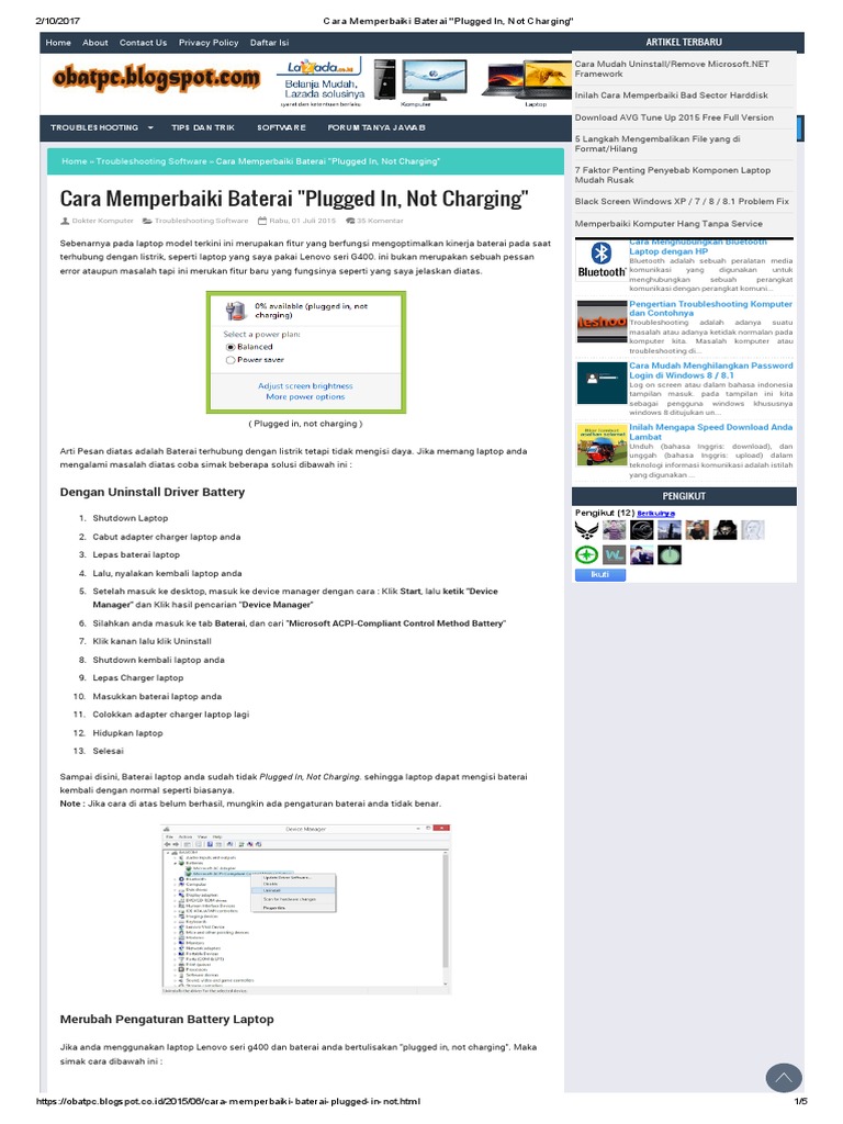 Cara mengatasi baterai laptop plugged in not charging windows 10. Biasanya tanda ini di tandai dengan adanya kata plugged in not charging di icon baterai anda. Bagaimana cara mengatasi battery plugged innot charging windows 10. Perilian cara ampuh memperbaiki baterai laptop yang rusak plugged in not charging sebenarnya pada laptop pada model terbaru mulai tahun 2013 sudah mengusung fitur yang berfungsi mengoptimalkan dan memaksimalkan kinerja baterai laptop pada saat laptop terhubung dengan listrik seperti laptop yang saya gunakan yaitu acer v5 yang merupakan laptop keluaran 2013.
