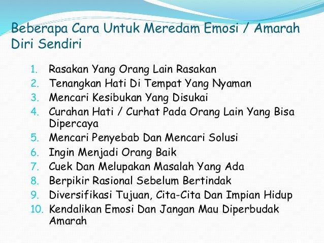 Cara mengatasi marah pada diri sendiri. Saya sedang emosi maka kita akan menangkapnya bahwa orang tersebut sedang marah. Maka dari itu teknik teknik ini perlu untuk anda persiapkan. Kuatkan niat dan tekad untuk tidak lagi membiarkan diri terbawa emosi.