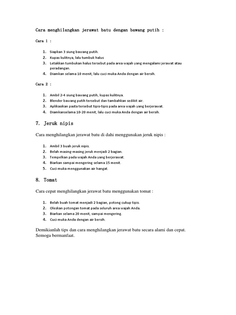 Bawang putih mampu mencegah munculnya jerawat batu yang baru dengan menghentikan proses peradangan. Cara mudah mengatasi jerawat batu dengan bawang putih jerawat batu merupakan jerawat yang susah untuk di sembuhkan akibat kurang dari merawat kebersighan wajah dan kulit wajah yang sensitif pada. Berikut adalah beberapa cara menghilangkan jerawat dengan bahan bahan alami.